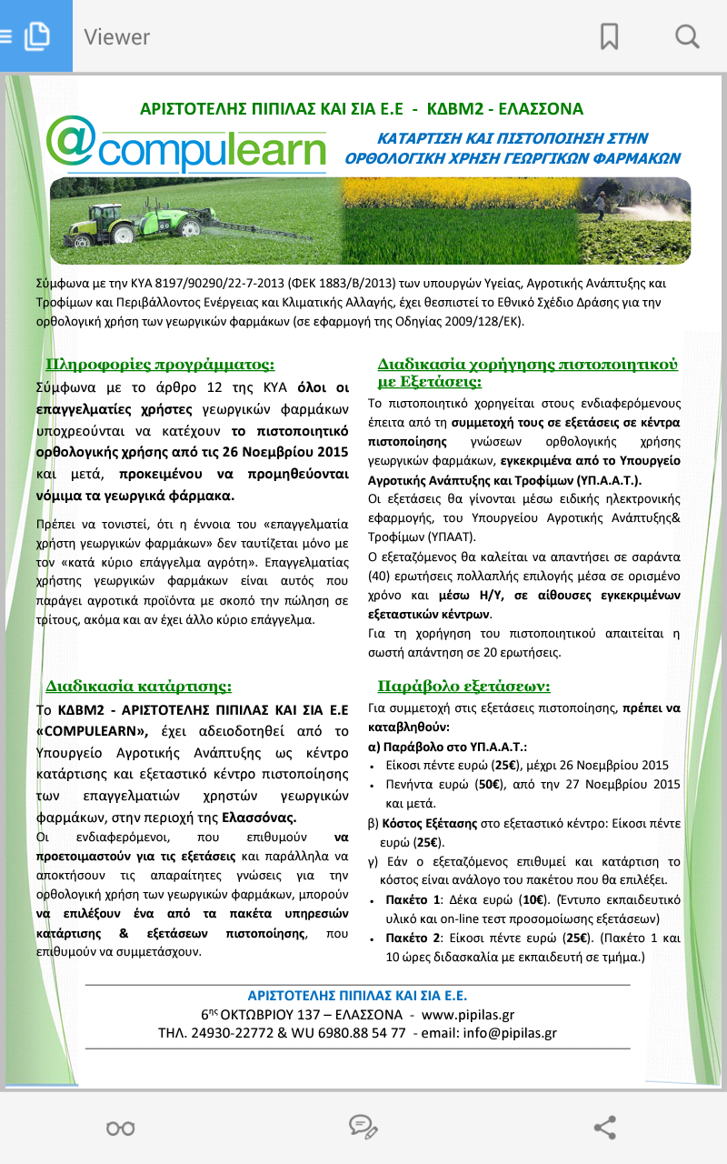 Πιστοποιητικό ορθολογικής χρήσης φυτοφαρμάκων 13 Οκτωβρίου, 2015 · by EVT Στο πολιτιστικό κέντρο της Δολίχης, σήμερα Τρίτη 6.30 μ.μ., θα πραγματοποιηθεί ενημέρωση γεωργών για την απόκτηση πιστοποιητικού ορθολογικής χρήσης φυτοφαρμάκων. Σε συνεργασία με την Ένωση Αγροτικών Συνεταιρισμών Ελασσόνας. Κοινοποιήστε: Κάνε κλικ για να μοιραστείς στο X(Ανοίγει σε νέο παράθυρο) Χ Πατήστε για κοινοποίηση στο Facebook(Ανοίγει σε νέο παράθυρο) Facebook Μου αρέσει! Φόρτωση...