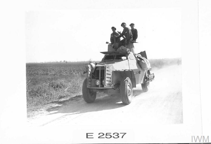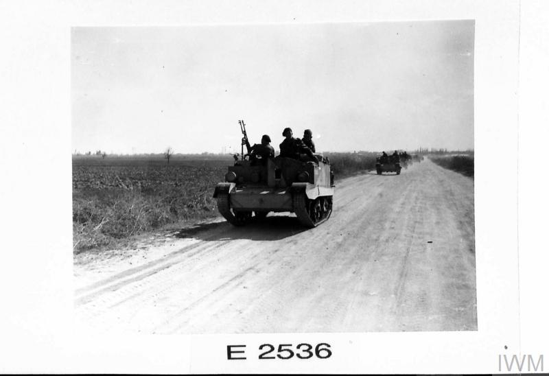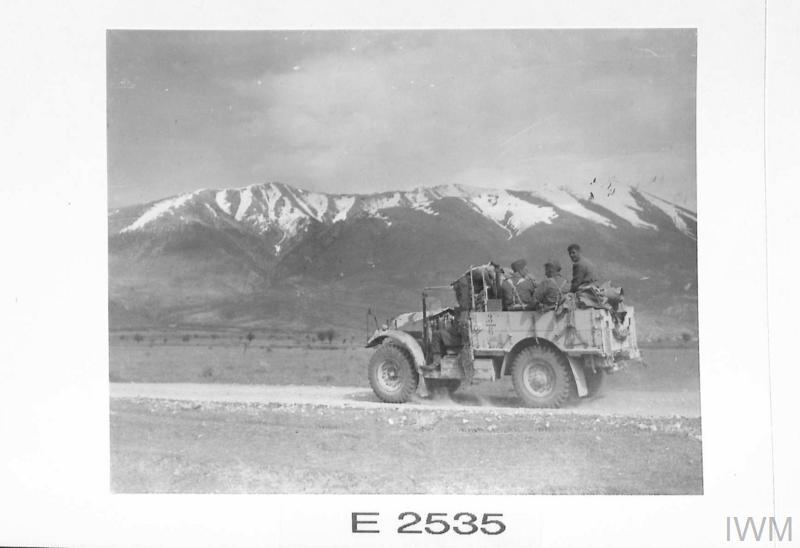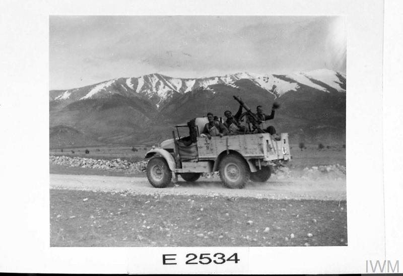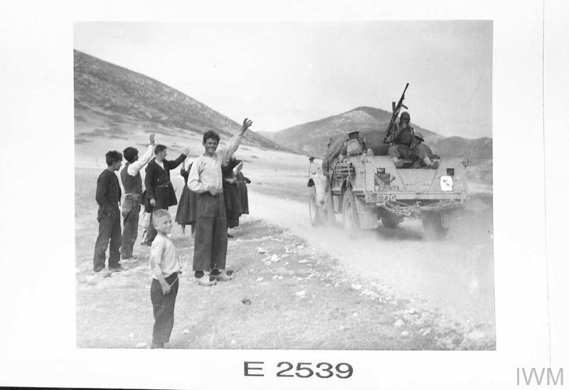 Στη φωτογραφία με κωδικό E 2539 από το Imperial War Museum, βλέπουμε ένα βρετανικό στρατιωτικό φορτηγό να κινείται με ταχύτητα προς τις περιοχές της πρώτης γραμμής («forward areas»). Η αυθεντική λεζάντα της εποχής σημειώνει χαρακτηριστικά: «Προς το μέτωπο! Ένα βρετανικό φορτηγό κατευθύνεται προς την πρώτη γραμμή, ενώ οι ντόπιοι κάτοικοι τους επευφημούν κατά τη διαδρομή».