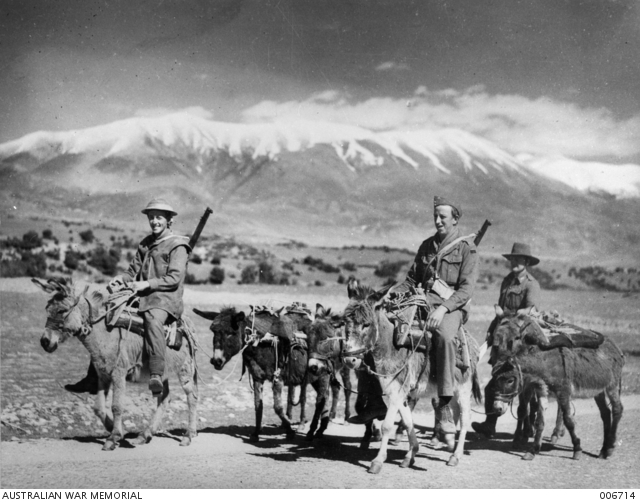 Στην εικόνα απεικονίζονται τρεις Αυστραλοί στρατιώτες (γνωστοί ως Diggers) να διασχίζουν την περιοχή μας χρησιμοποιώντας γαϊδούρια για τη μετακίνησή τους.