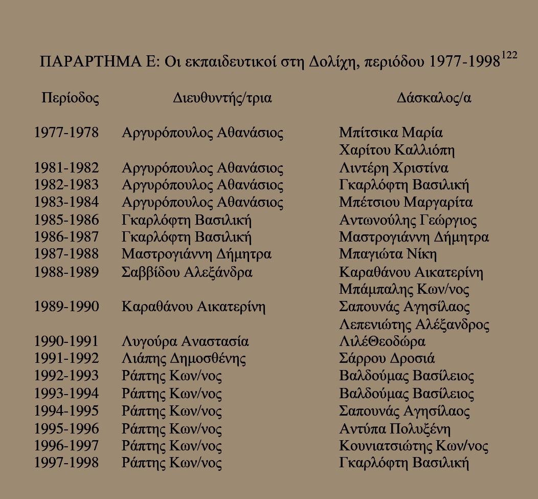 Στις αρχές του 20ού αιώνα στη Δολίχη λειτουργούσε μονοτάξιο, λιθόκτιστο Δημοτικό Σχολείο, το οποίο καταστράφηκε ολοσχερώς το 1943 από πυρκαγιά που προκάλεσαν οι Γερμανοϊταλοί. Για τα επόμενα χρόνια, έως το 1950, η εκπαιδευτική διαδικασία συνεχίστηκε αποσπασματικά, με μαθήματα που παρέδιδαν ο ιερέας του χωριού ή ιδιώτες γραμματοδιδάσκαλοι, λόγω έλλειψης σχολικού κτιρίου.