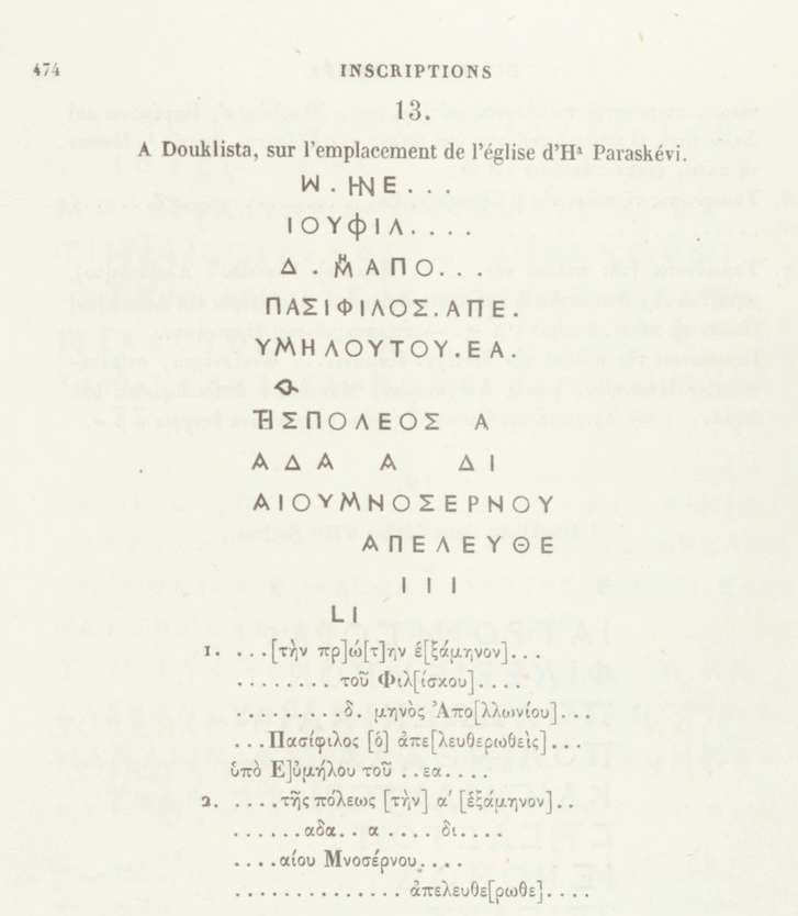Μεταξύ των αρχαίων καταλοίπων που καταγράφει ο Léon Heuzey στο έργο Le Mont Olympe et l’Acarnanie, η επιγραφή με αριθμό 13 (σελ. 474) ξεχωρίζει παρά το γεγονός ότι είναι φθαρμένη. Το εύρημα εντοπίστηκε στη θέση της εκκλησίας της Αγίας Παρασκευής (Ha Paraskévi) και, όπως φαίνεται από τα τμήματα που διασώζονται, πρόκειται για καταγραφή πράξεων απελευθέρωσης δούλων (manumissions), όπως και η επιγραφή της Παναγίας.