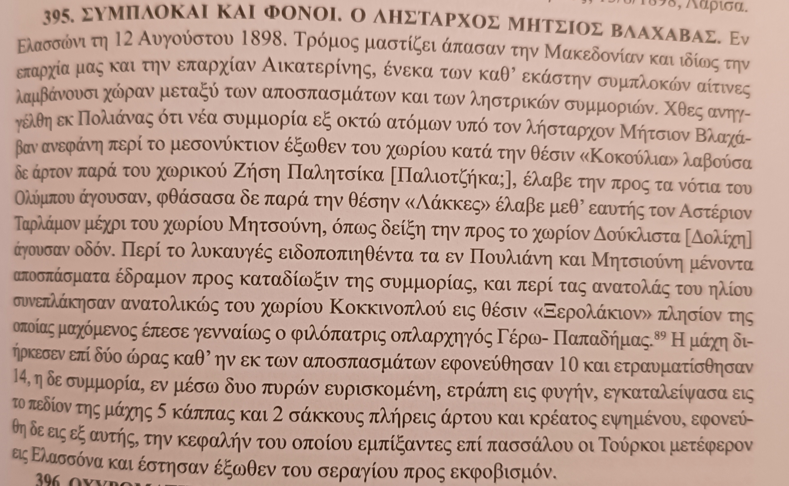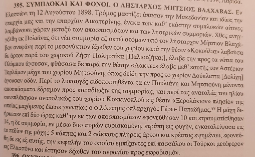 Πηγή: Εφημερίδα Όλυμπος (Λάρισα 23.8.1898). Βλ. Βασίλης Πλάτανος, Σελίδες από την ιστορία της Ελασσόνας και της περιοχής της (Συλλογή Ειδήσεων 1811-1912), Θεσσαλονίκη 2019, α/α είδησης: 395.