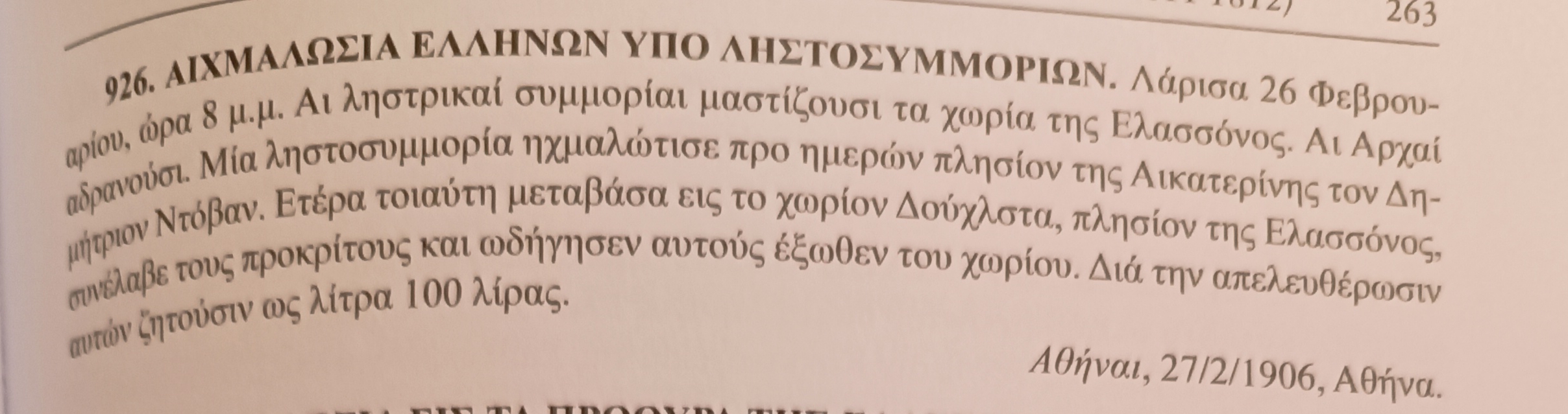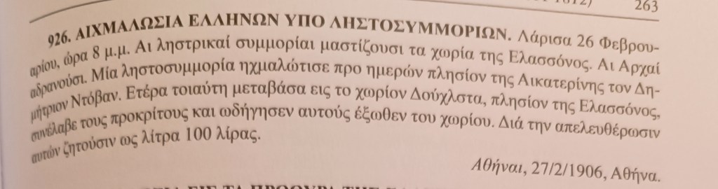 Πηγή: Εφημερίδα Αθήναι (Αθήνα 27.2.1906). Βλ. Βασίλης Πλάτανος, Σελίδες από την ιστορία της Ελασσόνας και της περιοχής της (Συλλογή Ειδήσεων 1811-1912), Θεσσαλονίκη 2019, α/α είδησης: 926.