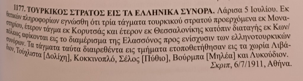 Πηγή: Εφημερίδα Σκριπ (Αθήνα 6.7.2011). Βλ. Βασίλης Πλάτανος, Σελίδες από την ιστορία της Ελασσόνας και της περιοχής της (Συλλογή Ειδήσεων 1811-1912), Θεσσαλονίκη 2019, α/α είδησης: 1177.